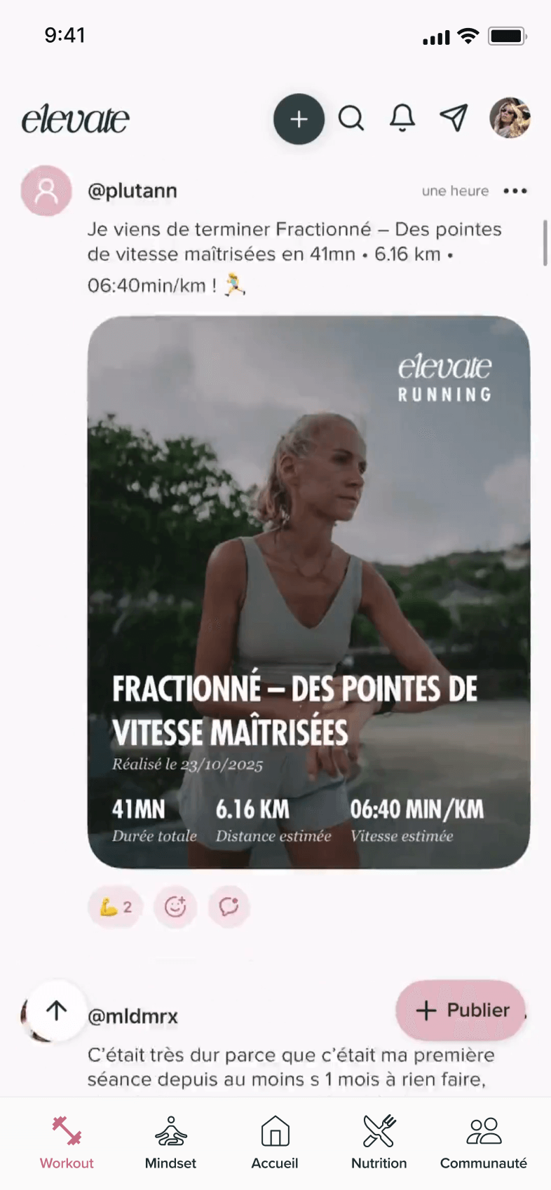 “J’adore l’application, elle est vraiment pensée comme un microcosme! On a tout au même endroit, avec une belle d.a en plus donc ça fait plaisir et ça donne envie. Il y en a pour tout le monde au niveau des entraînements, des séances à la carte en plus des programmes donc on ne s'ennuie pas. La partie bien-être, c’est vraiment un plus avec les méditations, comme la partie nutrition super bien pensé. On peut tout planifier, on a une liste de course, franchement, c’est trop cool de tout avoir au même endroit. Et le gros plus c’est la partie communauté, c’est super innovant et super motivant! Honnêtement c’est vraiment différent de ce qui se fait et c’est vraiment qualitatif, trop contente d’évoluer avec la team Elevate 🫰🏻”